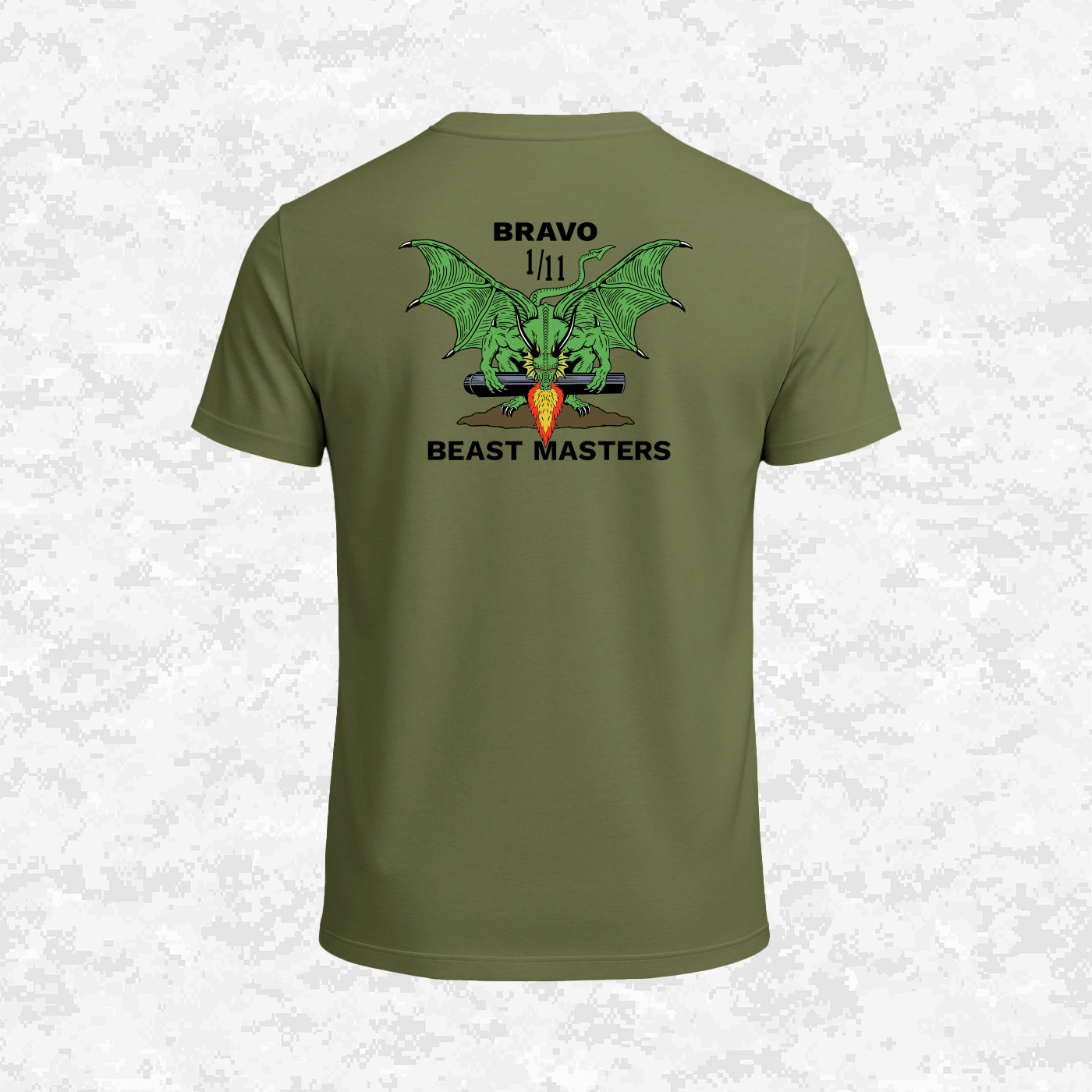 The T-shirt for Bravo Battery, 1st Battalion, 11th Marine Regiment. The design features a fierce dragon (the 'Beast') breathing fire over an artillery cannon, symbolizing the unit's devastating firepower and precision that earned them the nickname "Beast Masters."