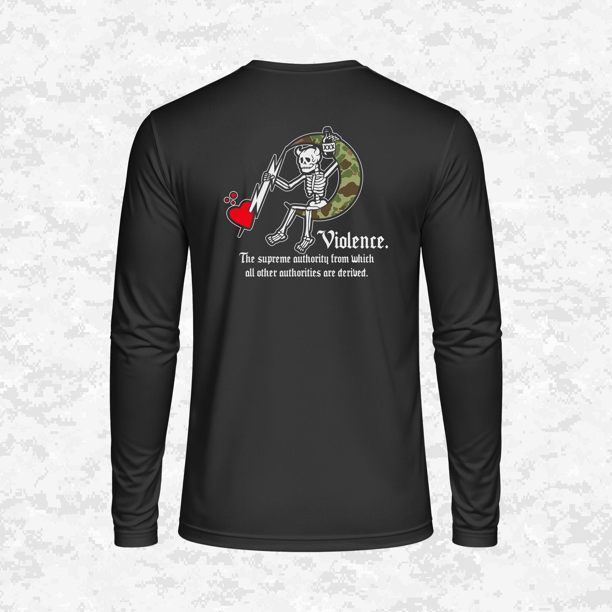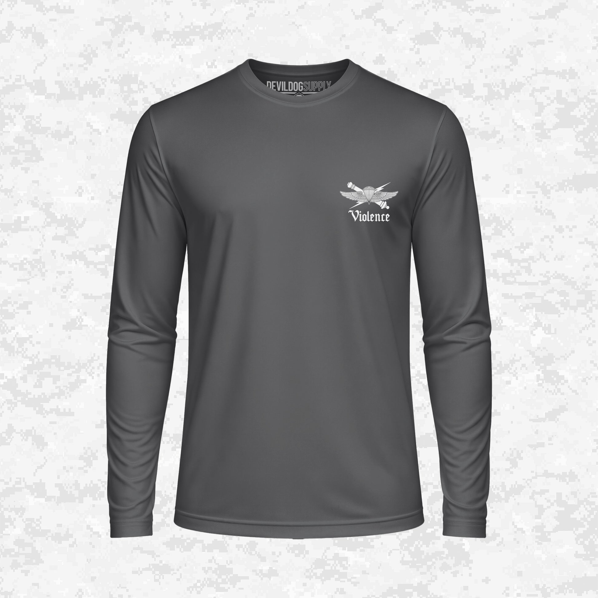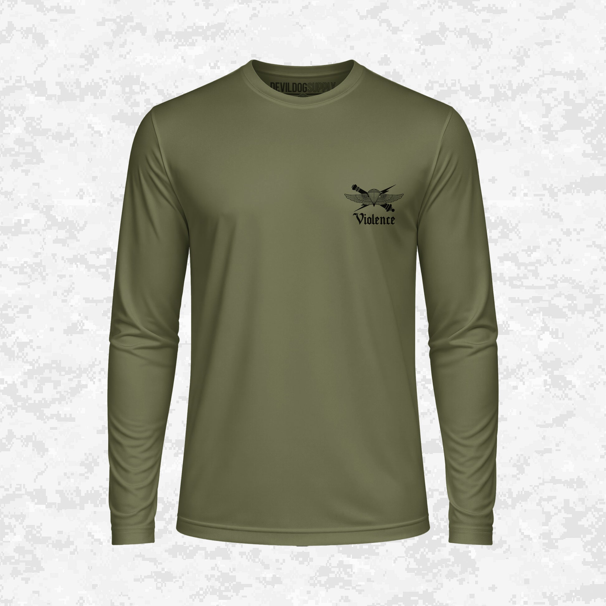 A powerful statement on operational strength and the necessity of controlled Violence. The back design, inspired by the 4th ANGLICO emblem, combines wings, a lightning bolt, and a skull sitting on a camo crescent moon, holding a bottle and a sword through a heart. It's an uncompromising, bold representation that force is the ultimate authority. The small chest logo is the primary 4th ANGLICO emblem with the word "Violence" beneath it, upholding the message of power.