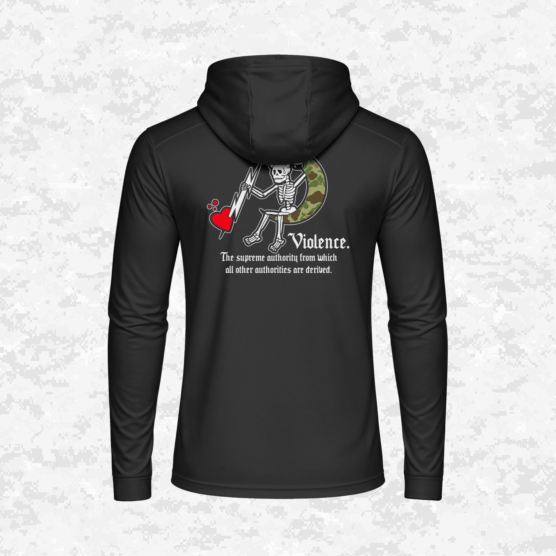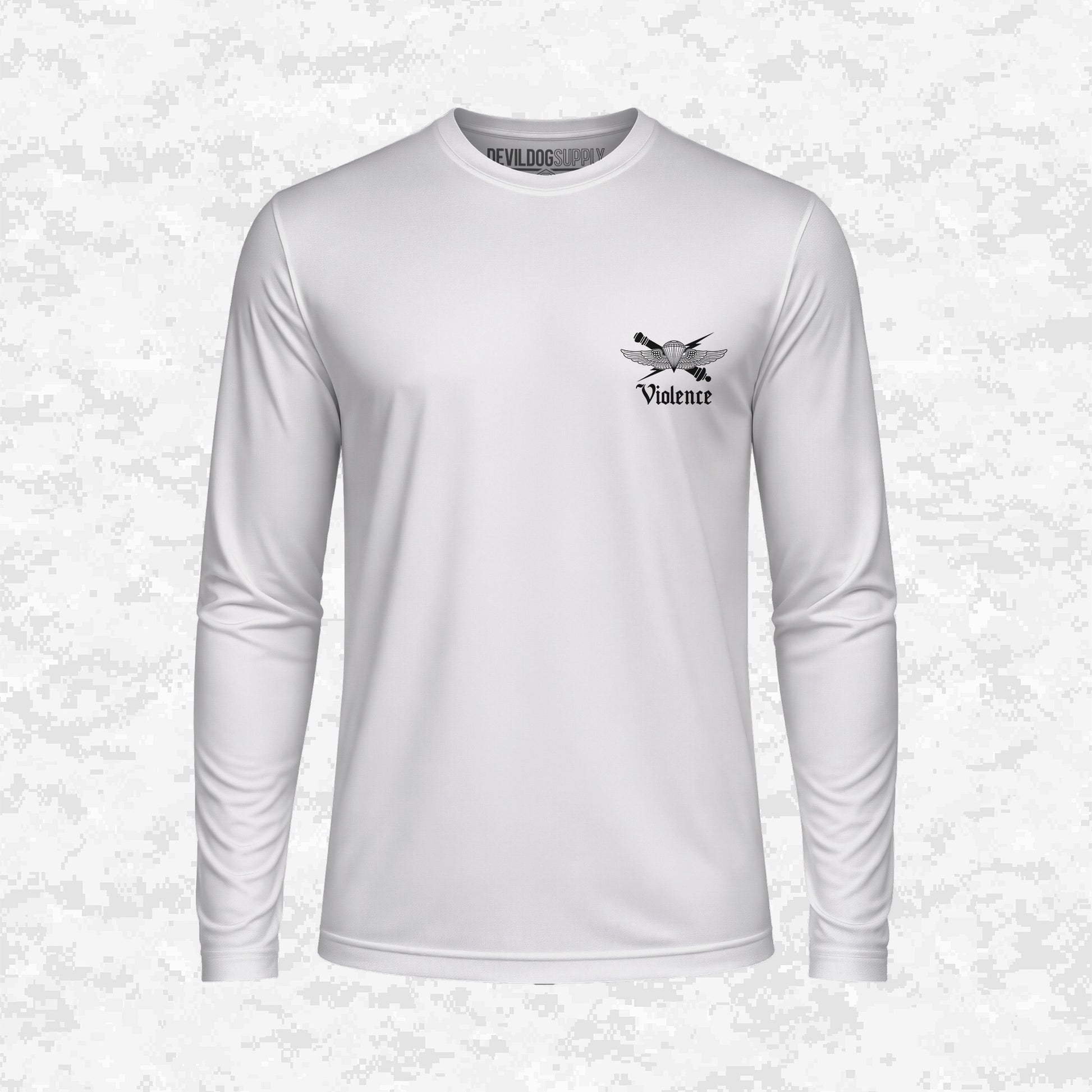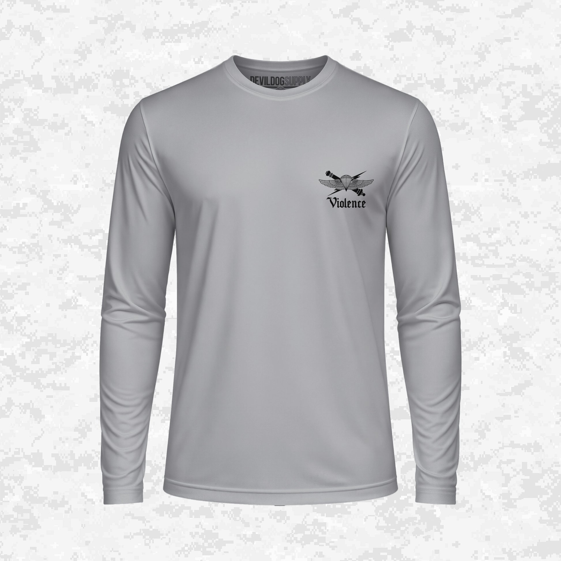 A powerful statement on operational strength and the necessity of controlled Violence. The back design, inspired by the 4th ANGLICO emblem, combines wings, a lightning bolt, and a skull sitting on a camo crescent moon, holding a bottle and a sword through a heart. It's an uncompromising, bold representation that force is the ultimate authority. The small chest logo is the primary 4th ANGLICO emblem with the word "Violence" beneath it, upholding the message of power.