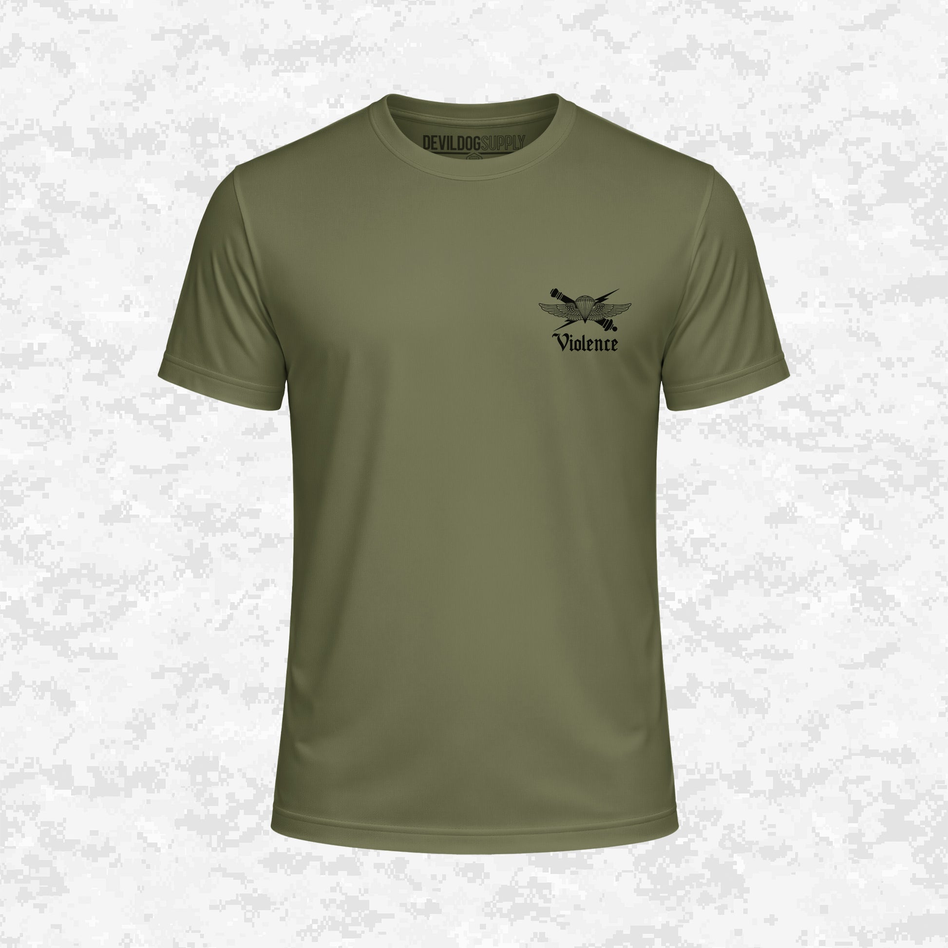 A powerful statement on operational strength and the necessity of controlled Violence. The back design, inspired by the 4th ANGLICO emblem, combines wings, a lightning bolt, and a skull sitting on a camo crescent moon, holding a bottle and a sword through a heart. It's an uncompromising, bold representation that force is the ultimate authority. The small chest logo is the primary 4th ANGLICO emblem with the word "Violence" beneath it, upholding the message of power.