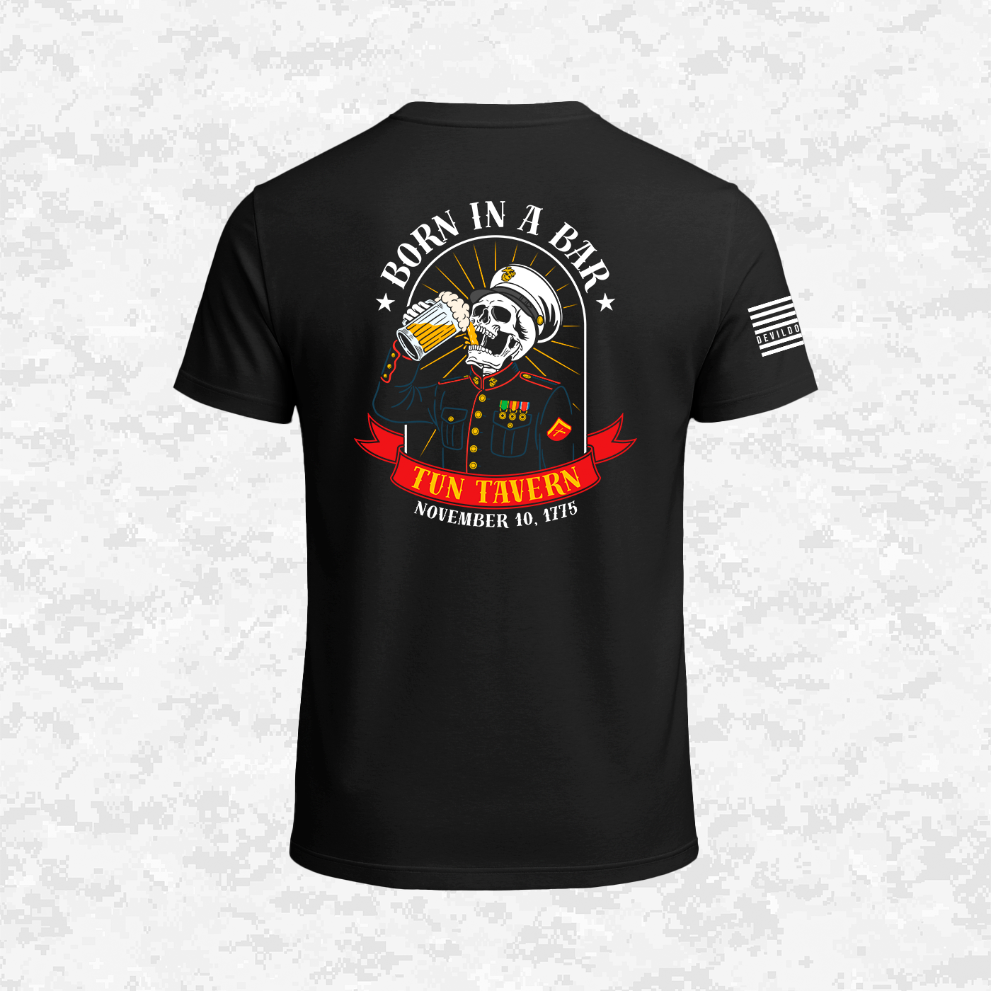 This fun design represents the symbolism and pride of the phrase 'born in a bar', an event that took place on November 10, 1775, at the iconic Tun Tavern.