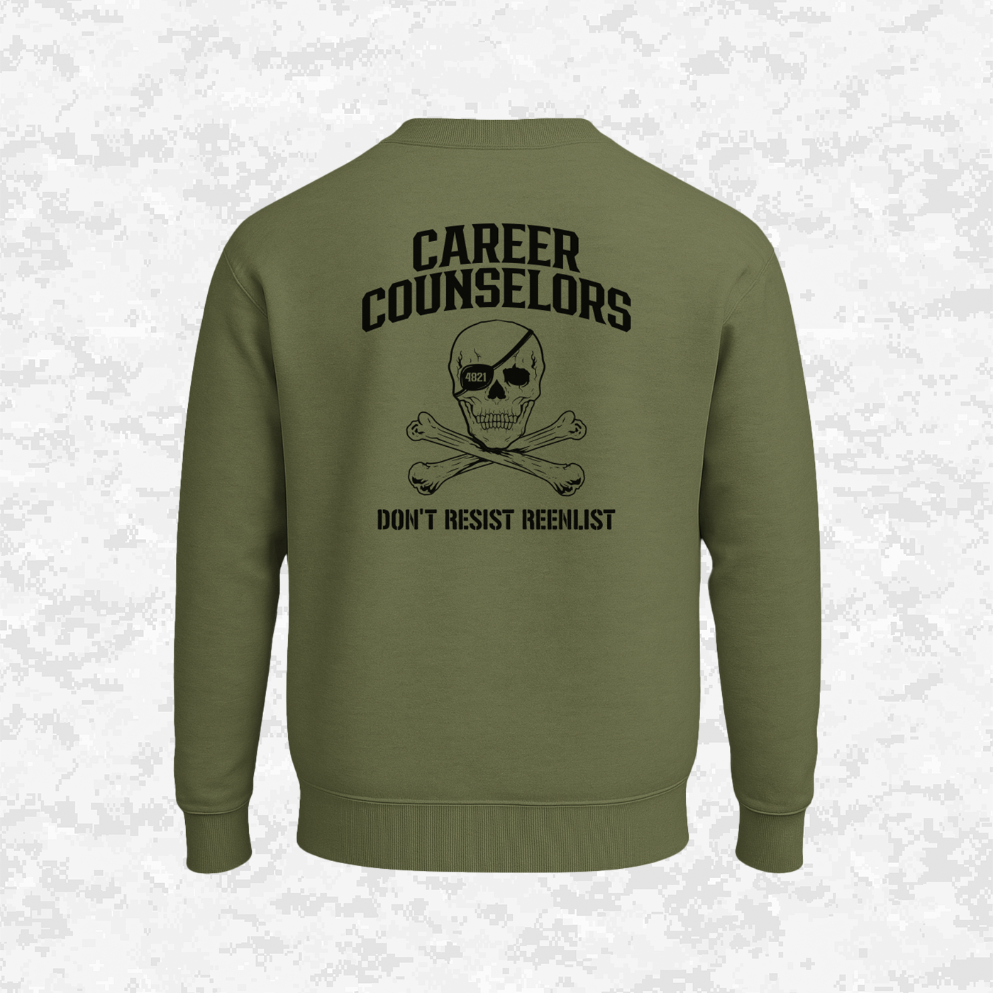 This design is a powerful adaptation of the iconic Jolly Roger (pirate flag), transforming it into a symbol of military re-enlistment humor. The eye patch features the 4821 MOS (Marine Career Counselor), representing the 'pirates' who 'capture' and retain service members. The bold phrase, "DON'T RESIST REENLIST," satirically captures the relentless pressure and sense of eternal duty within the Marine Corps (USMC).