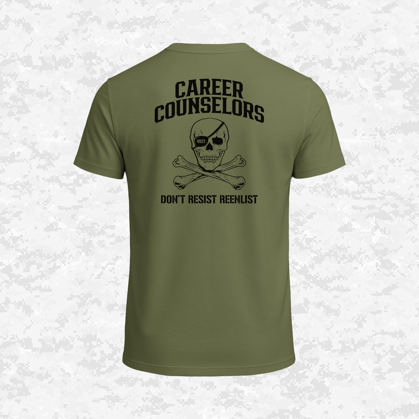This design is a powerful adaptation of the iconic Jolly Roger (pirate flag), transforming it into a symbol of military re-enlistment humor. The eye patch features the 4821 MOS (Marine Career Counselor), representing the 'pirates' who 'capture' and retain service members. The bold phrase, "DON'T RESIST REENLIST," satirically captures the relentless pressure and sense of eternal duty within the Marine Corps (USMC).