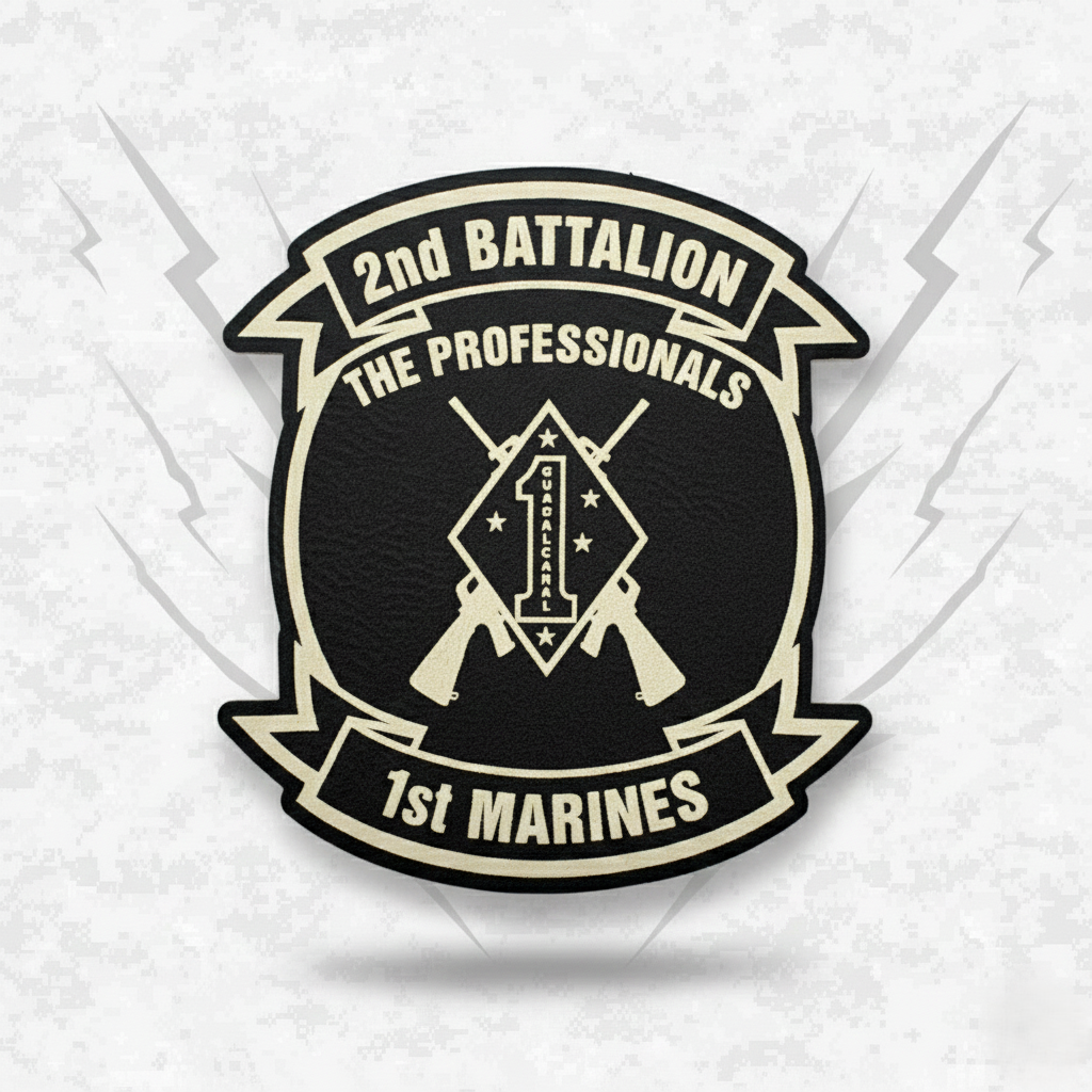 Pay tribute to the 2nd Battalion, 1st Marines, proudly known as "The Professionals," with this premium leather patch. The central design features the iconic 1st Marine Division diamond with the "1" and "GUADALCANAL".