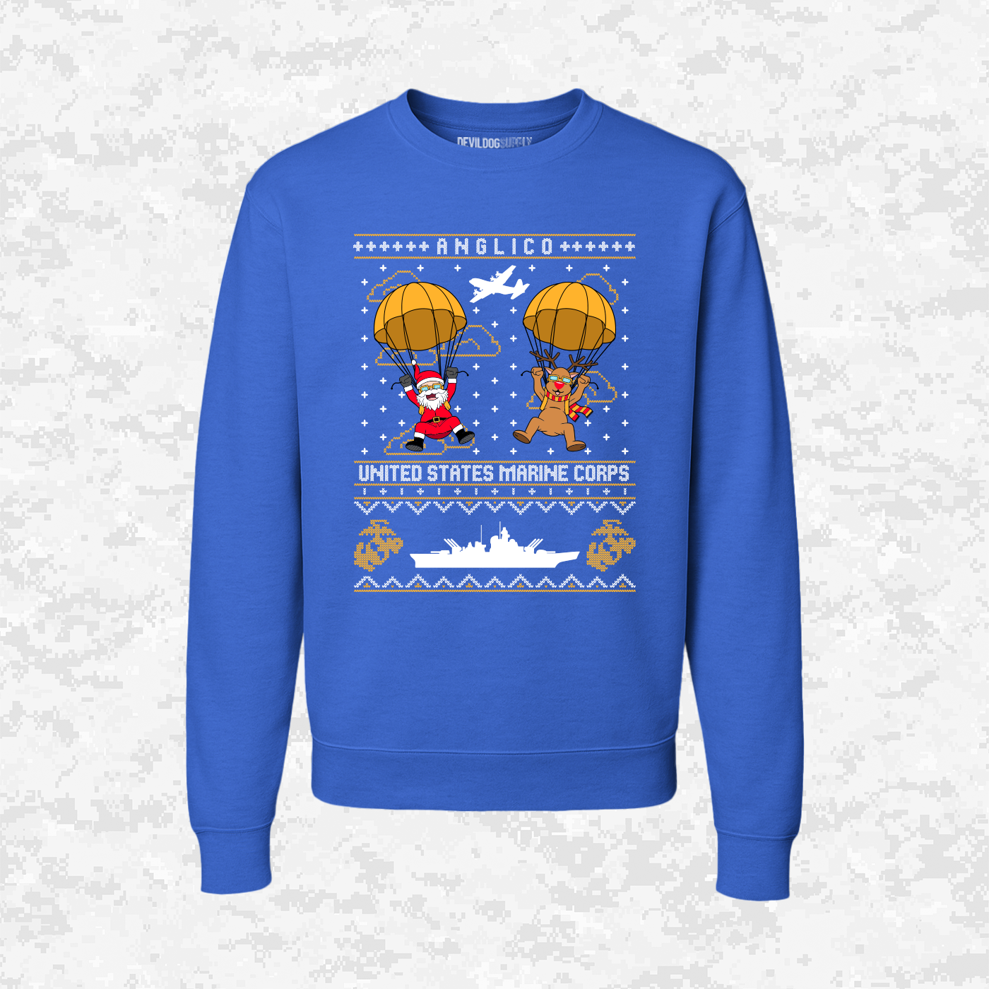 A celebration of ANGLICO pride with a holiday twist. This design, which mimics the festive pattern style, shows Santa and his reindeer parachuting from the air, with a warship at the base. It symbolizes the Marine Corps unit's capability to coordinate fire support by air and sea—even during the holidays!