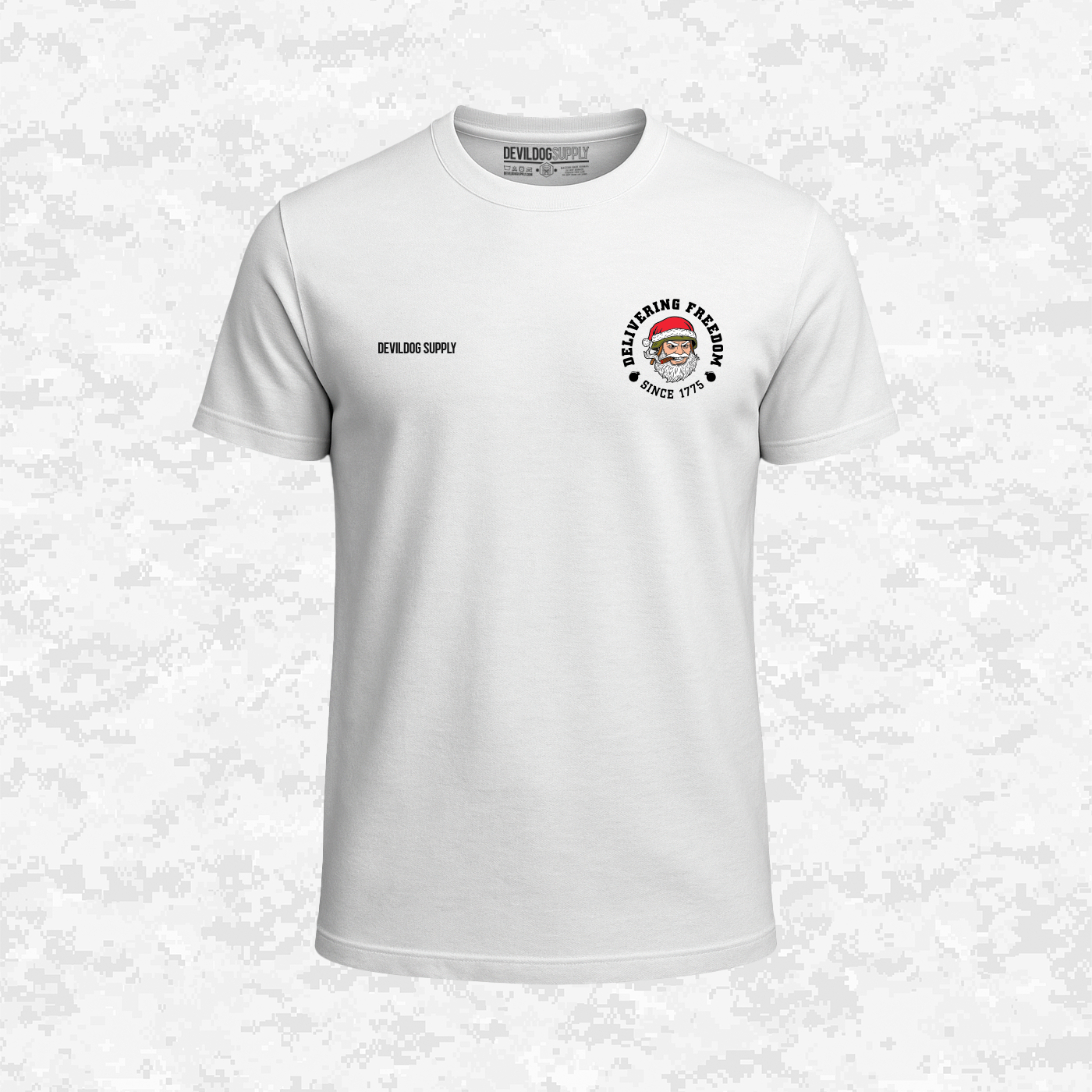 Short Description (UPDATED for both logos): Gear up for the holidays with the only Santa licensed to deliver Freedom. The main back design features Semper Claus complete with a tactical rifle, combat helmet, and the iconic EGA, embodying the Marine spirit of protecting and serving... since 1775. The small front logo (or chest logo) complements the design with the detailed image of Semper Claus framed by the words "Delivering Freedom Since 1775". The perfect festive shirt.